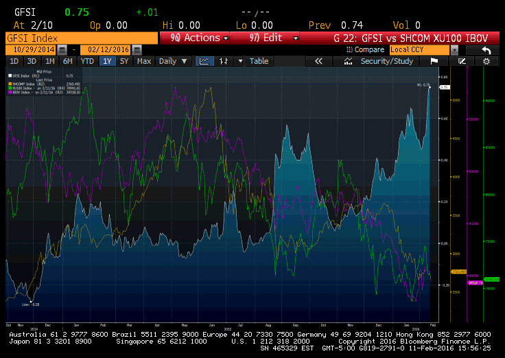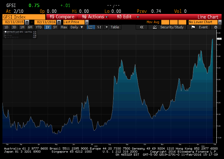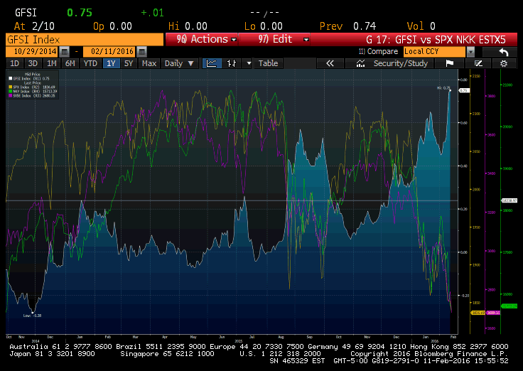The Global Financial Stress Index is a Bank of America Merrill Lynch calculated, cross market measure of risk, hedging demand and investor flows in the global financial system. Levels greater/less than 0 indicate more/less financial market stress than normal. Apart from the headline GFSI, there are three sub-indices, RISK, FLOW and SKEW.